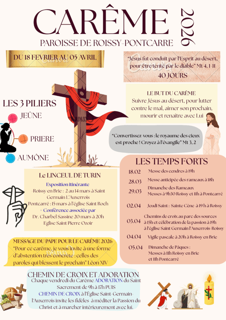Retrouvez dans le mémo ci-joint, les rendez-vous et recommandations de ce Carême 2026 à Roissy en Brie et Pontcarré.